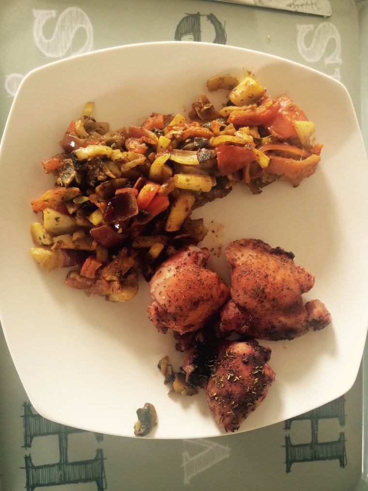 chicken thighs pan backed in herbs, with organic veggie medley of squash, tomatoes, red onions, mushrooms.
