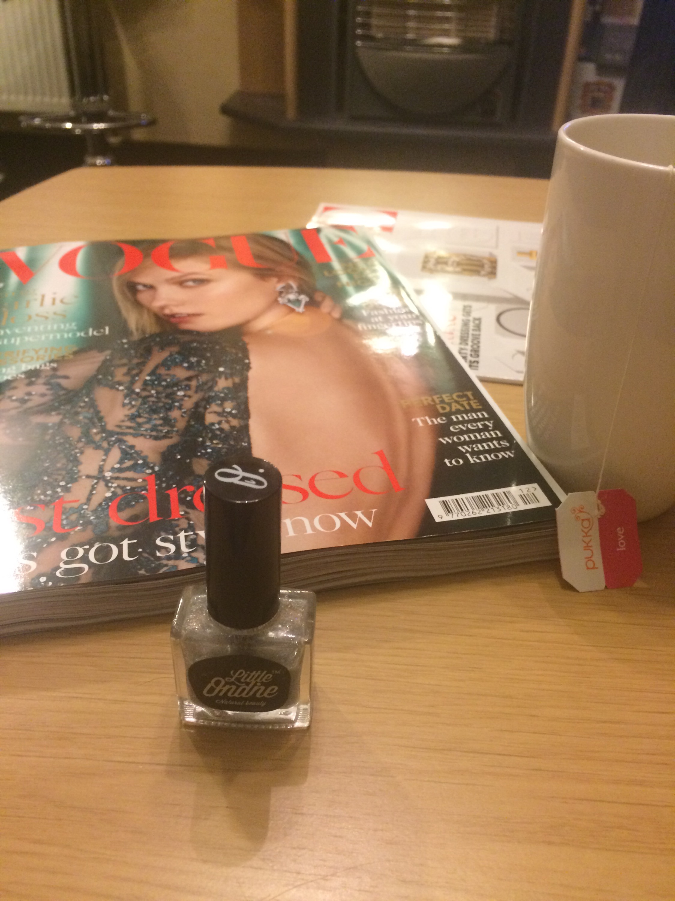 So, post shower I slipped on my new cozy slippers and painted my nails in my favourite sparkly little Ondine non- toxic nail varnish with a cup of pukka organic herbal tea and a copy of vogue!